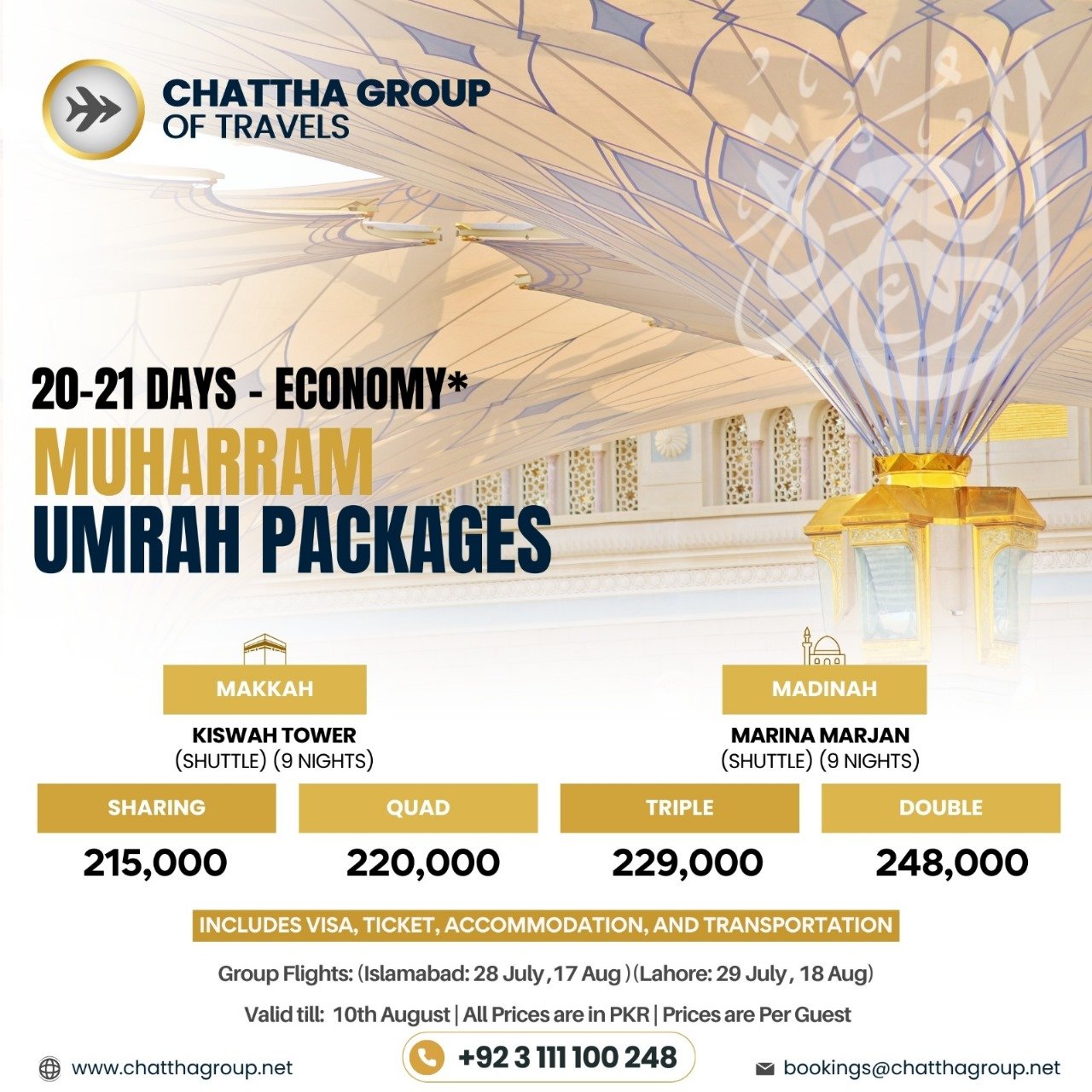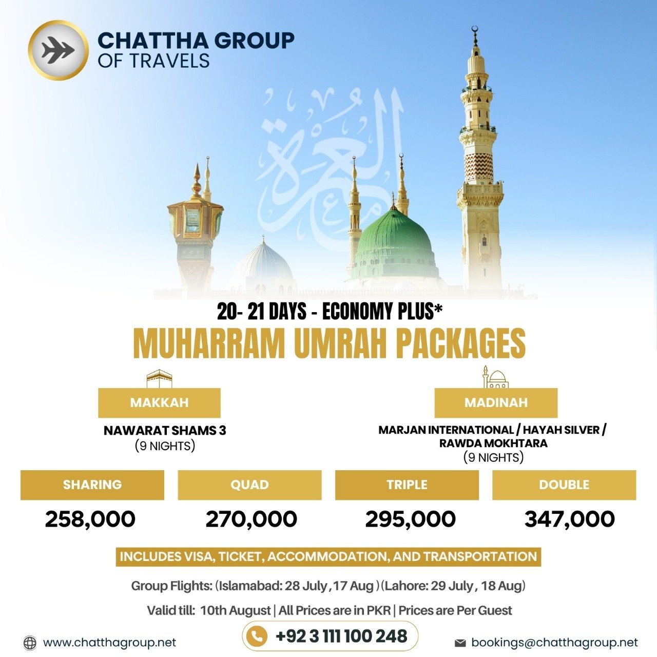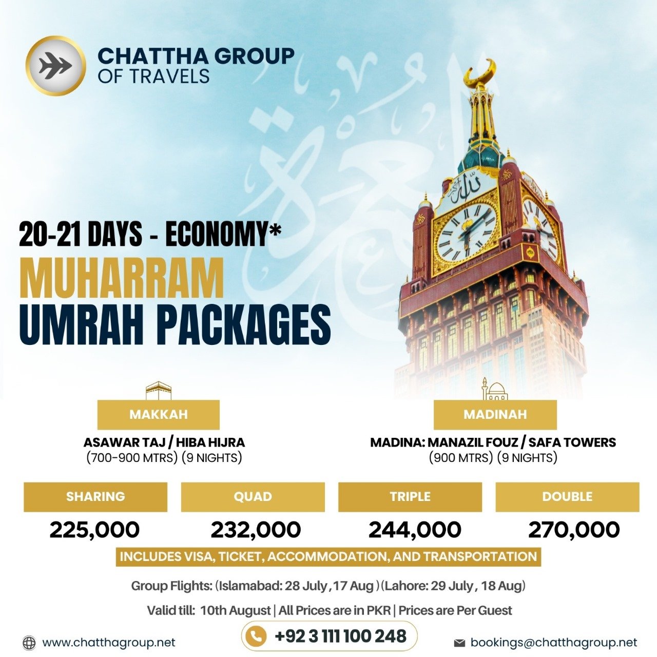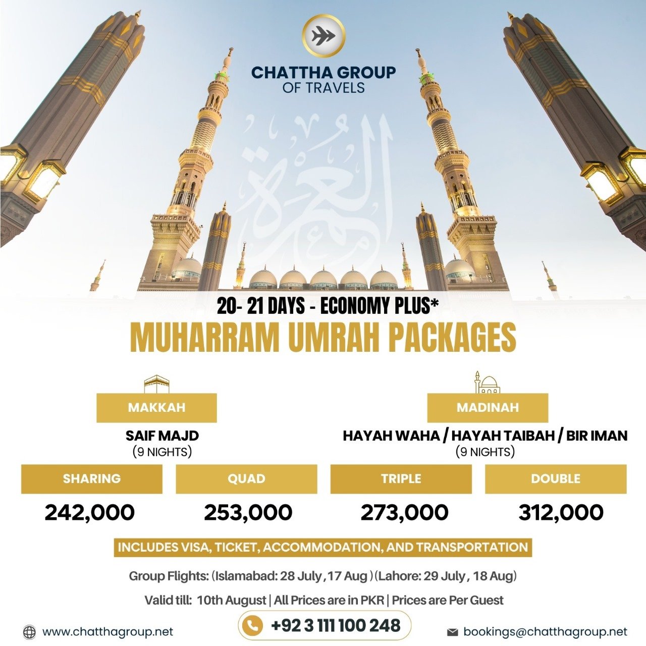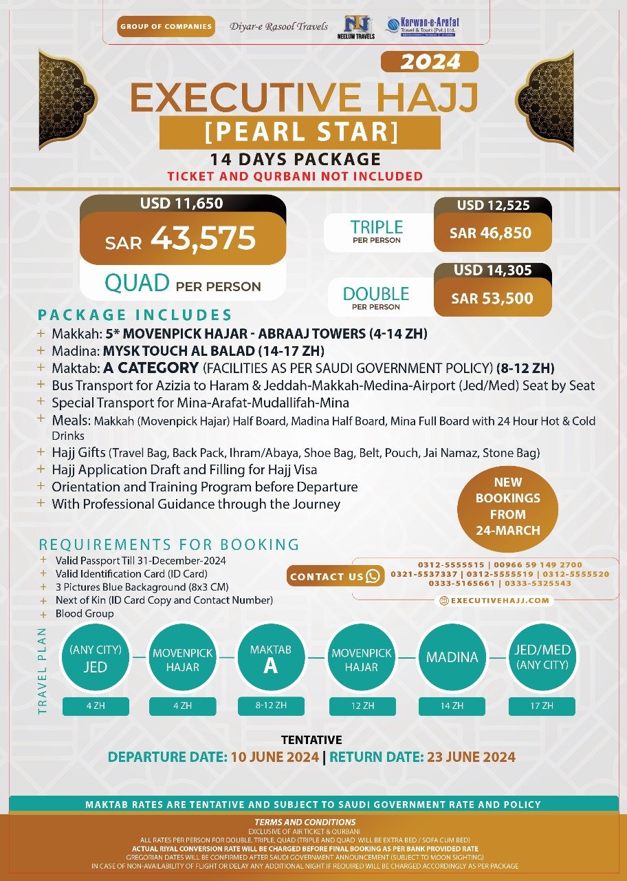 Our exclusive packages for Executive Hajj, Umrah, and tours to selected countries, offered by Chattha Group, are meticulously crafted to provide a seamless and enriching experience. These packages combine luxury and convenience with spiritual fulfillment, ensuring that every aspect of your journey is handled with care and attention.